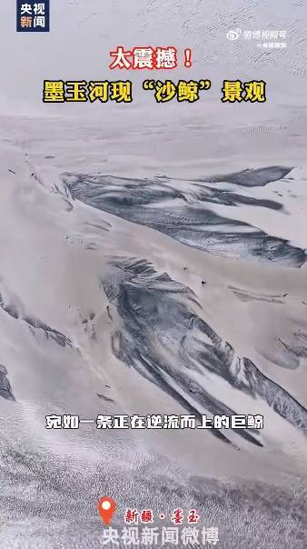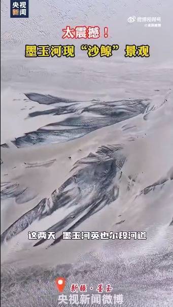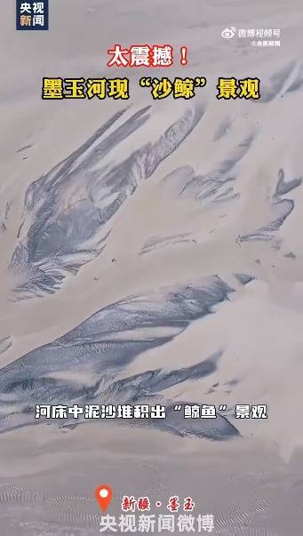 近日,新疆墨玉河英也尔段河水渐退,泥沙堆积出“鲸”的形状,犹如巨鲸逆流而上。